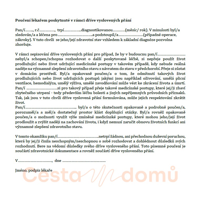 Poučení pacienta lékařem by stejně jako dříve vyslovené přání mělo být vysoce individualizovaným dokumentem. Inspirací pro formální náležitosti nicméně může být přiložená šablona poučení lékaře k DVP.