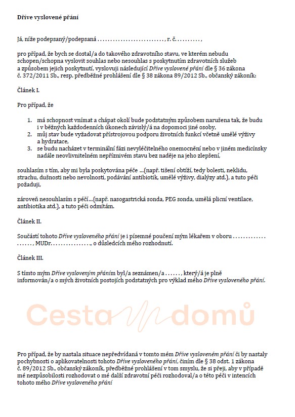 Vzor dříve vysloveného přání zahrnující předběžné prohlášení